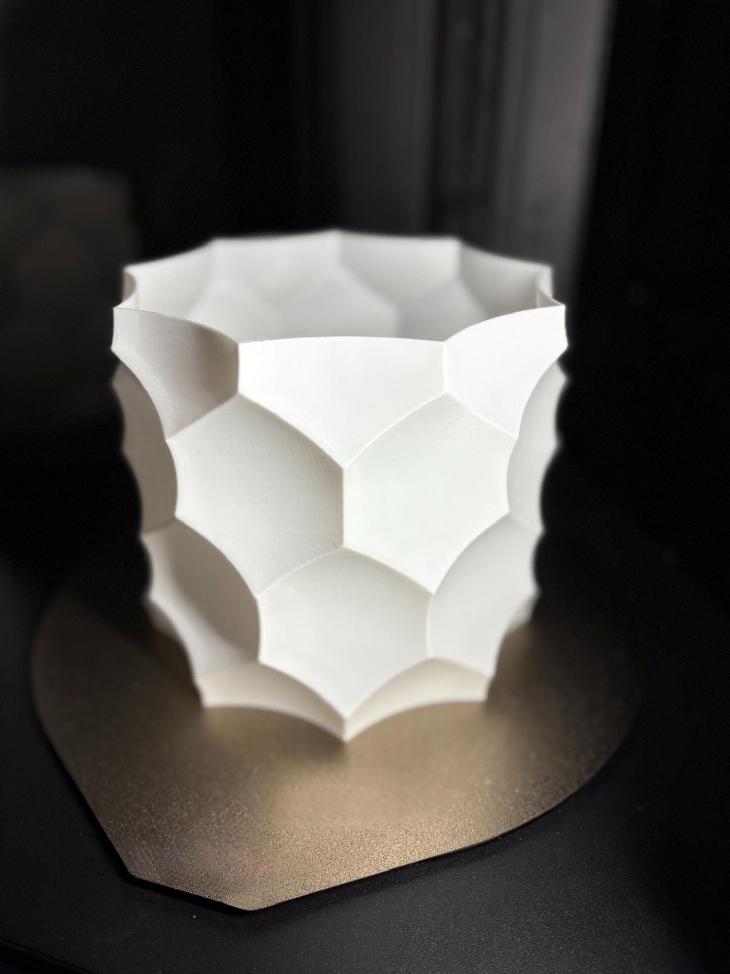 Moderní dekorativní nádoba s výraznou geometrickou strukturou. Vhodná jako nádoba na květináč, obal pro dekorativní aranžmá nebo designový interiérový doplněk. Vyrobeno v České republice
